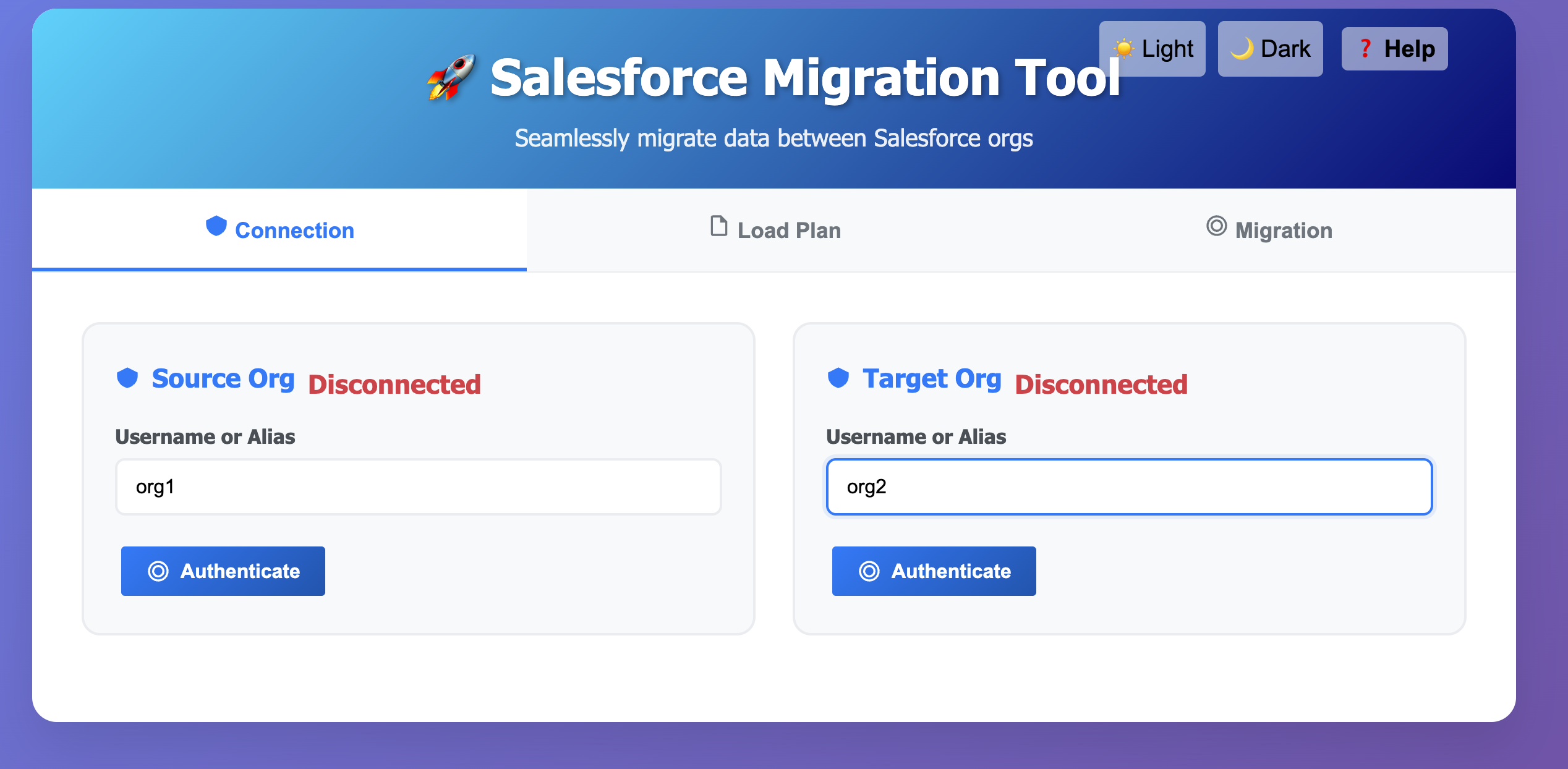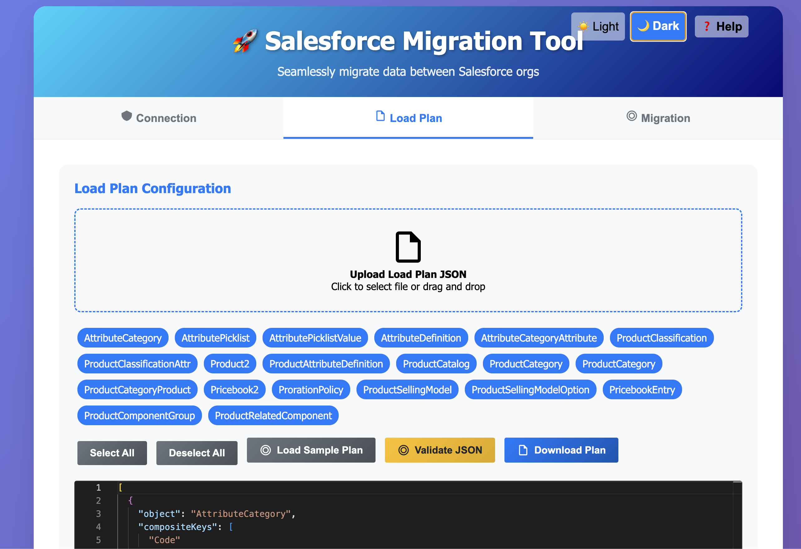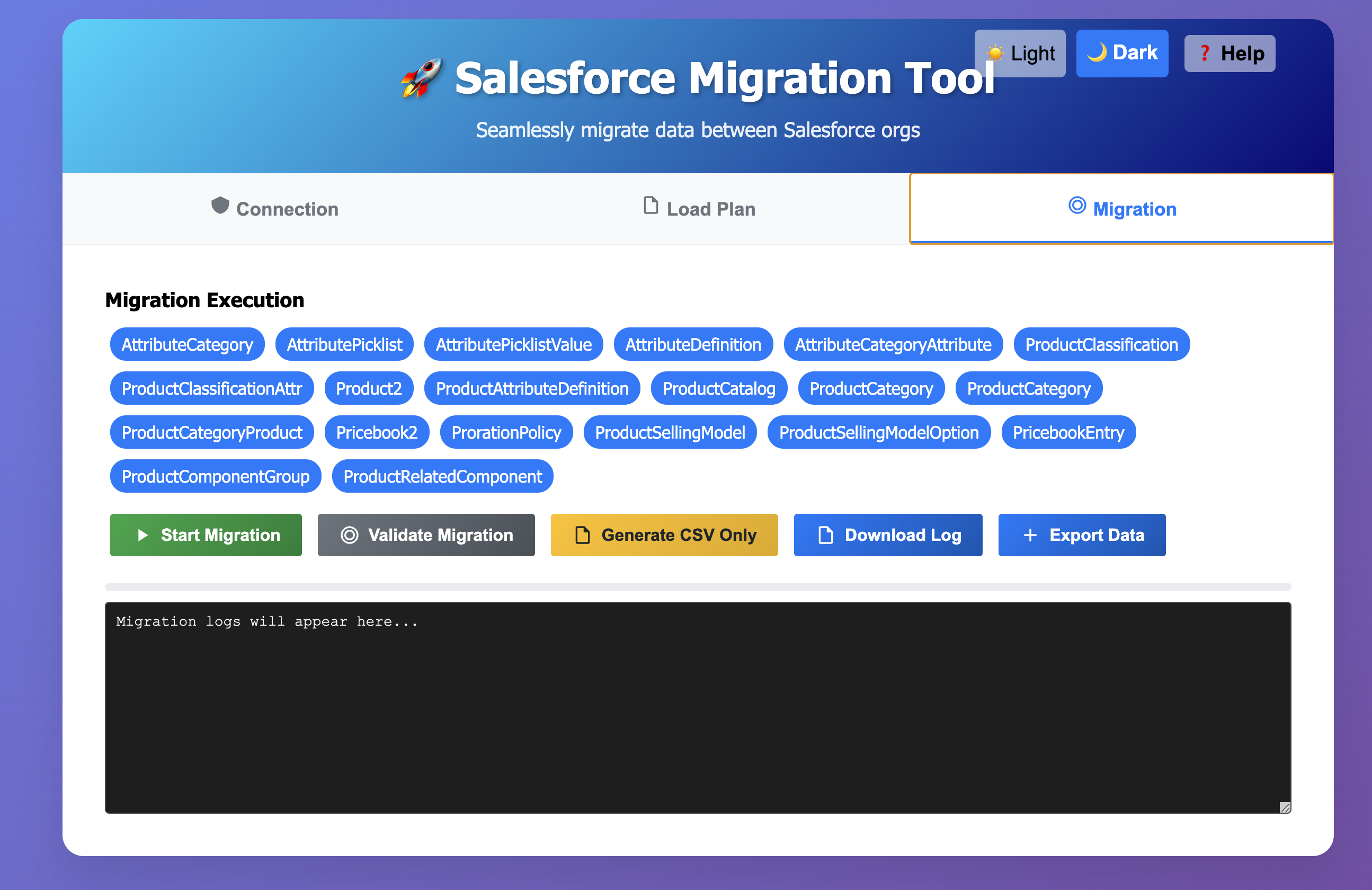The Salesforce Migration Tool is a modern desktop application designed to help data migration between Salesforce organizations. It supports complex data migrations, including single and two-step processes, using JSON load plans to define objects, queries, and field mappings. The tool leverages the Salesforce CLI and Bulk API 2.0 for secure and efficient data operations.